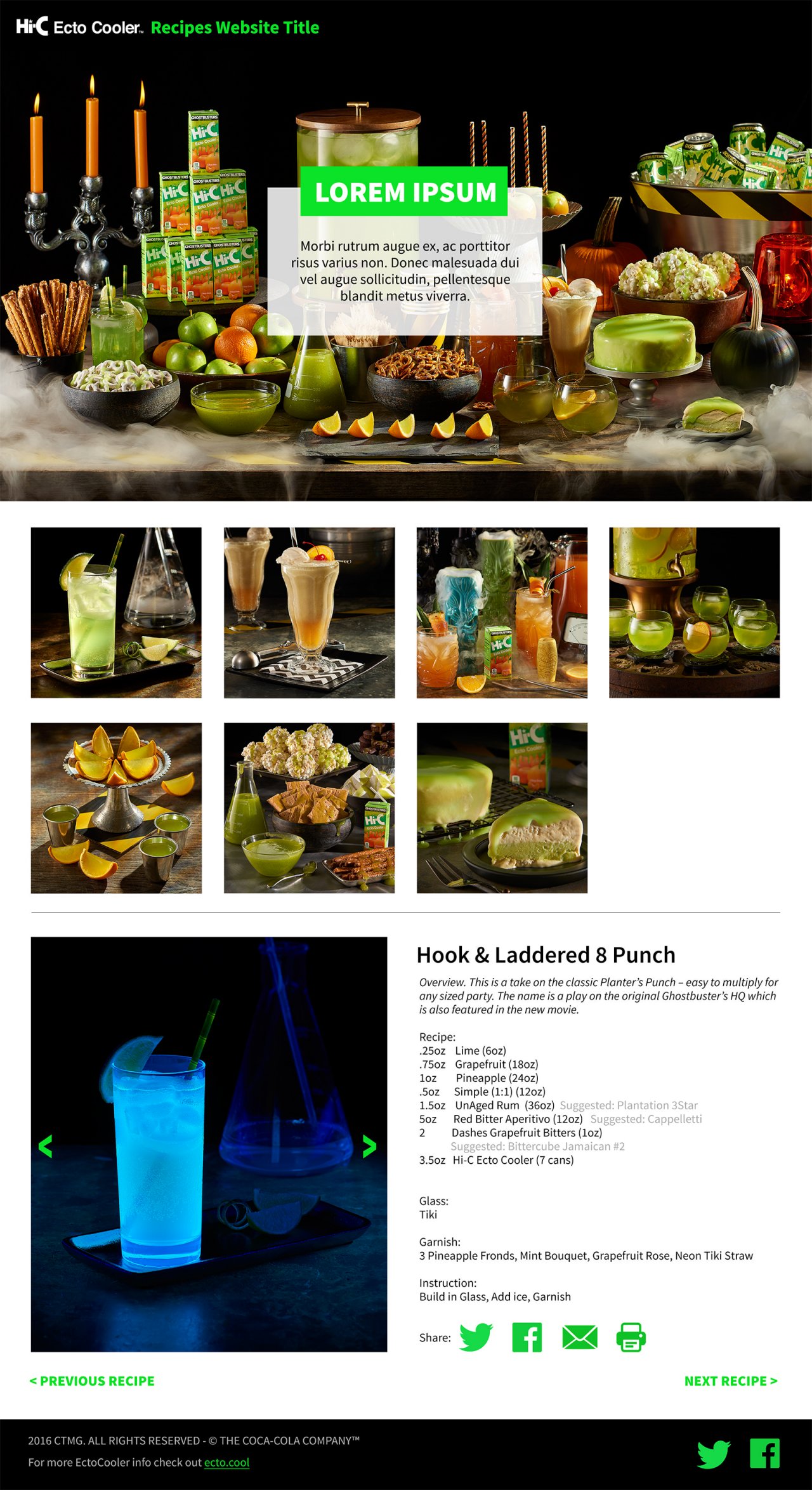 In advance of the Ghostbusters (2016) Halloween release on DVD, we partnered with Ben Spangler (of Milkjam Creamery and Rustica fame) and several Bittercube mixologists to create food and drink recipes inspired by the cult classic cooler. Photos and recipes were available on Hi-C Ecto Cooler social channels and a custom designed website.