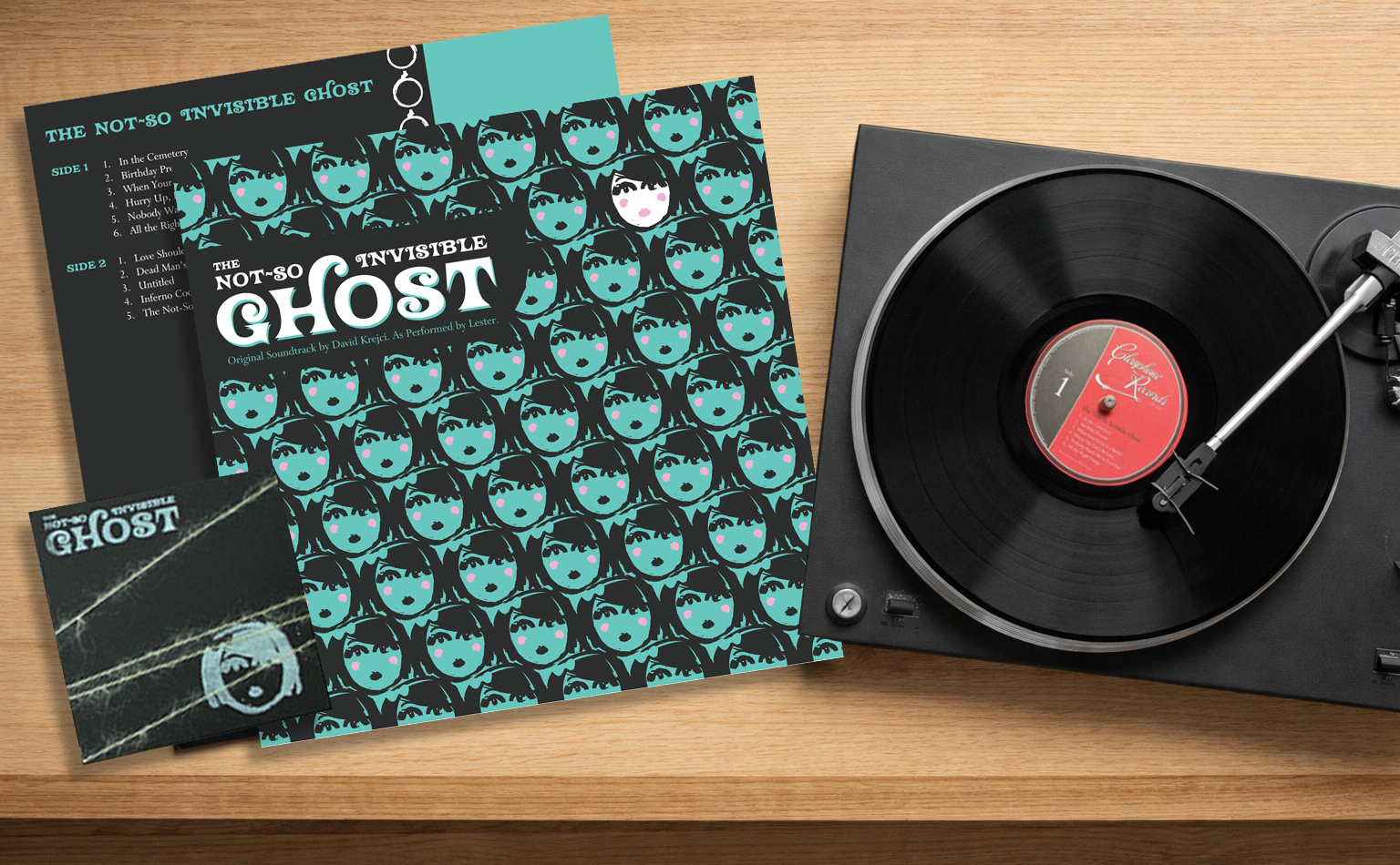 The Not-So Invisible Ghost LP and CD packaging for Cleophone Records. The album traces two ill-fated lovers and the haunting feeling of sensing someone everywhere after they're gone. Every element was made by hand: a screenprinted 12″ vinyl as the centerpiece, a CD package built from scrap paper, rubber stamps, and colored yarn. Nothing slick. Everything intentional. Award: AIGA MN Design Show.